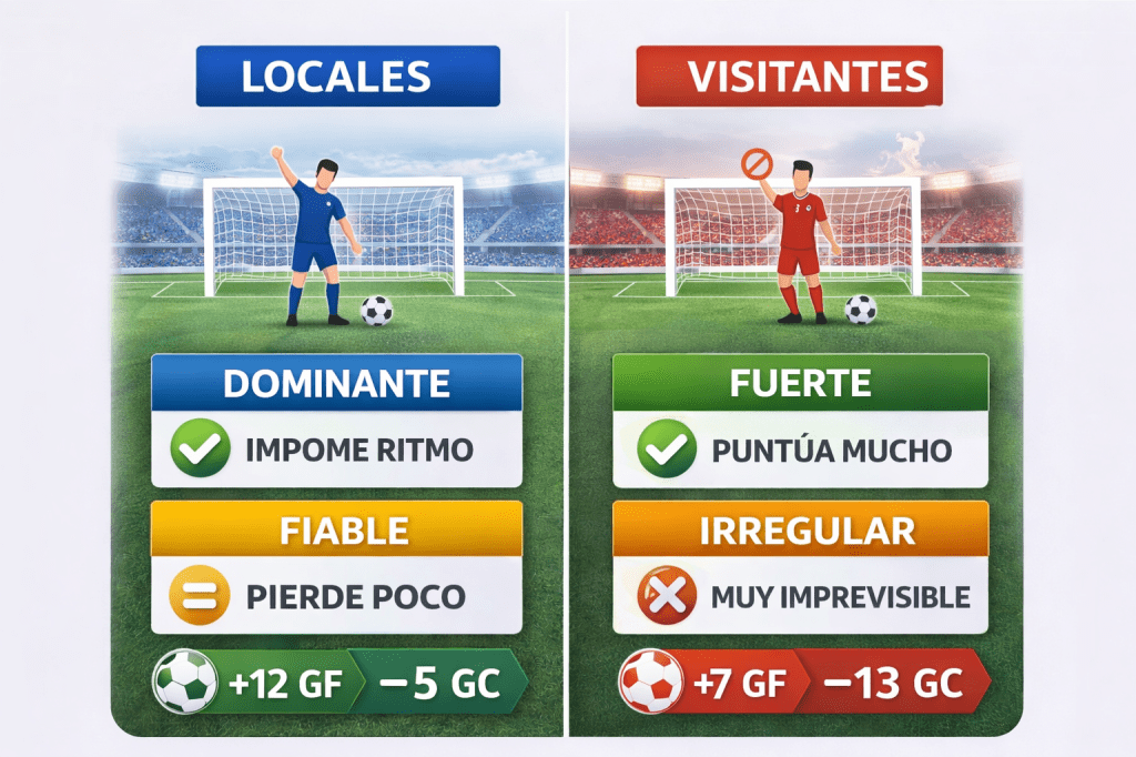 Muchos análisis parten de estadísticas generales de temporada. El problema es que esos datos mezclan partidos en casa y fuera, ocultando diferencias muy claras. Un equipo puede ser dominante como local y muy débil como visitante, o al revés.