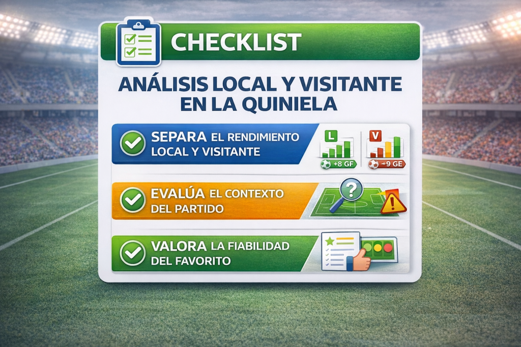 Checklist visual con los pasos clave para analizar el factor local y visitante antes de elegir el signo en la quiniela, ayudando a ajustar el riesgo según el comportamiento real de cada equipo en su contexto de juego.