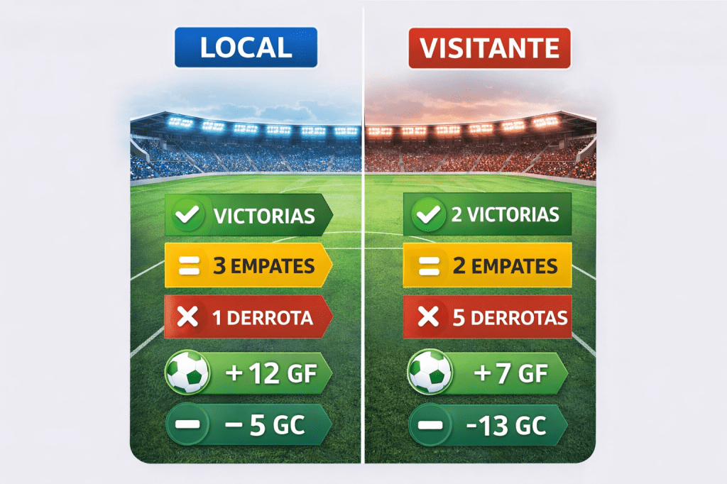 Comparativa clara del rendimiento de un equipo cuando juega como local y cuando actúa como visitante, mostrando diferencias en resultados y goles que influyen directamente en el análisis de la quiniela.
