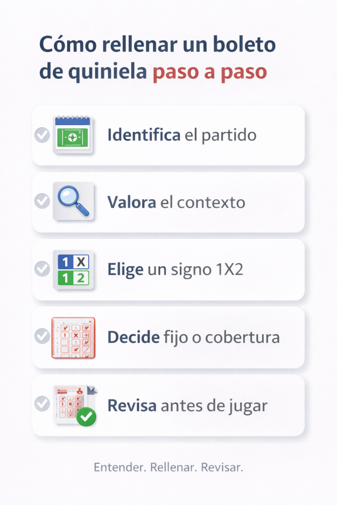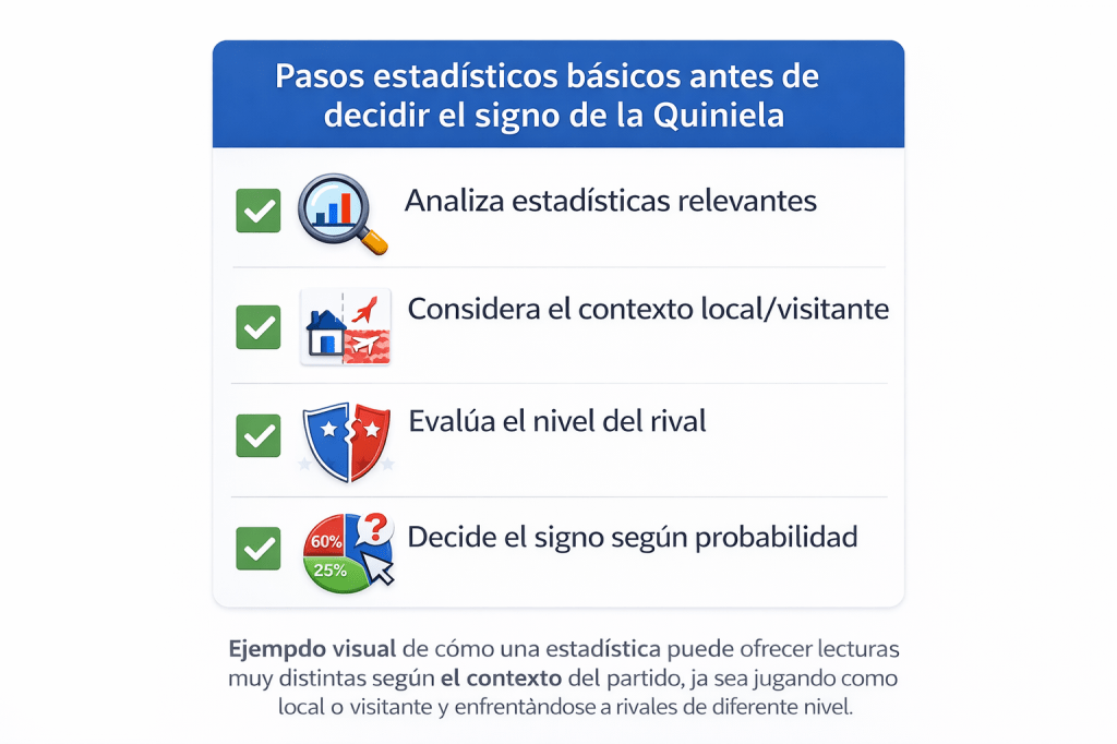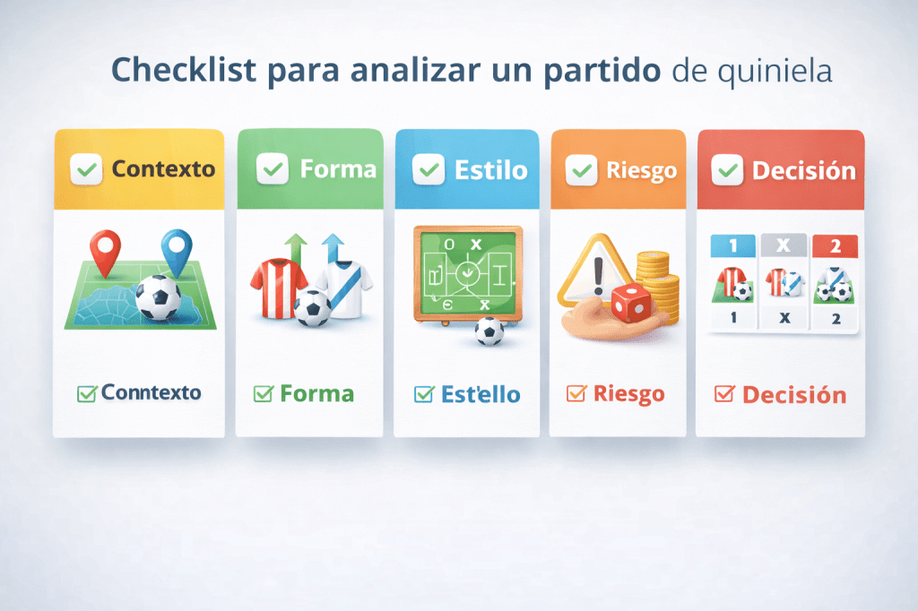Checklist visual con los pasos clave para analizar el factor local y visitante antes de elegir el signo en la quiniela, ayudando a ajustar el riesgo según el comportamiento real de cada equipo en su contexto de juego.