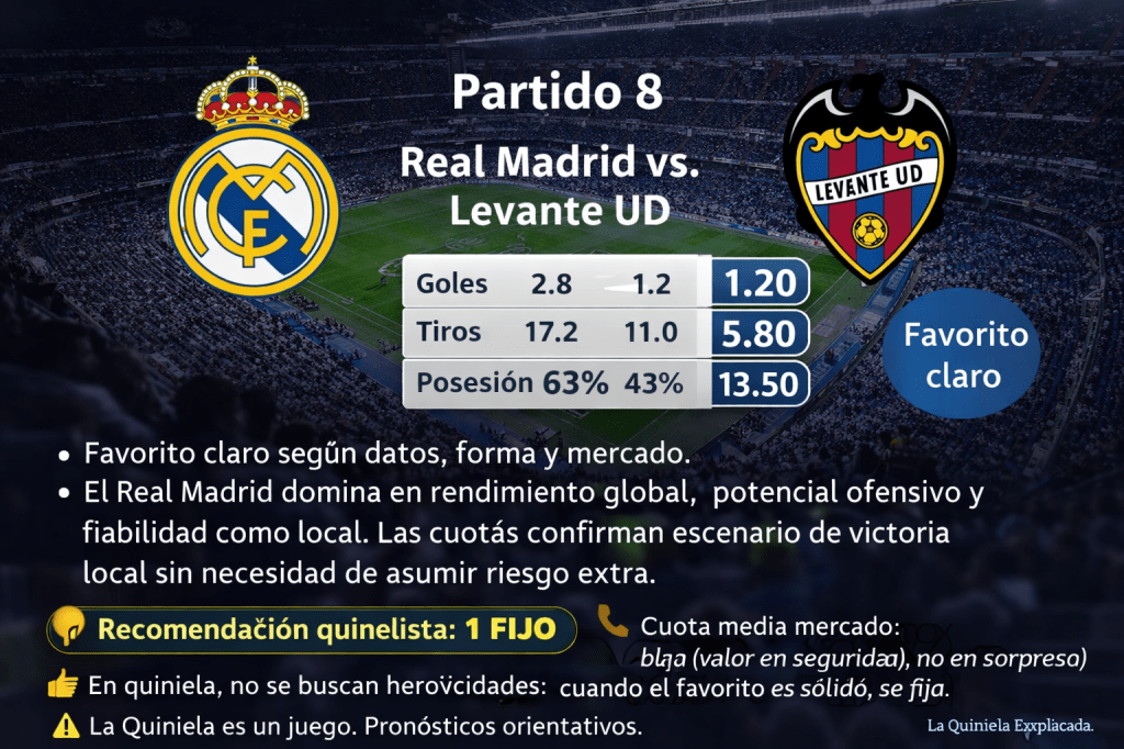Partido 8 · Real Madrid vs Levante UD Favorito claro según datos, forma y mercado. El Real Madrid domina en rendimiento global, potencial ofensivo y fiabilidad como local. Las cuotas confirman escenario de victoria local sin necesidad de asumir riesgo extra. 📌 Recomendación quinielista: 1 FIJO 📉 Cuota media mercado: baja (valor en seguridad, no en sorpresa)