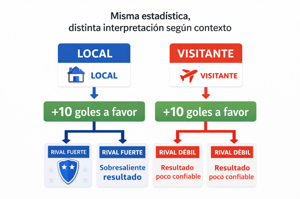 Muchos análisis parten de estadísticas generales de temporada. El problema es que esos datos mezclan partidos en casa y fuera, ocultando diferencias muy claras. Un equipo puede ser dominante como local y muy débil como visitante, o al revés.